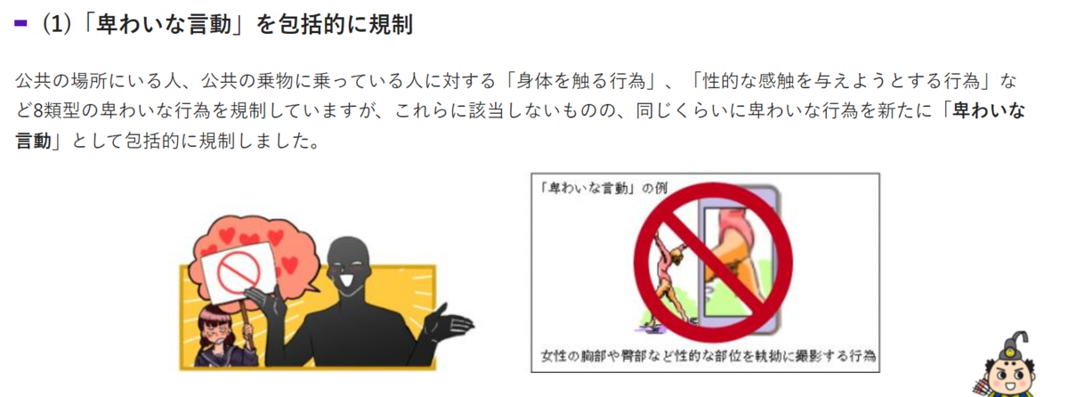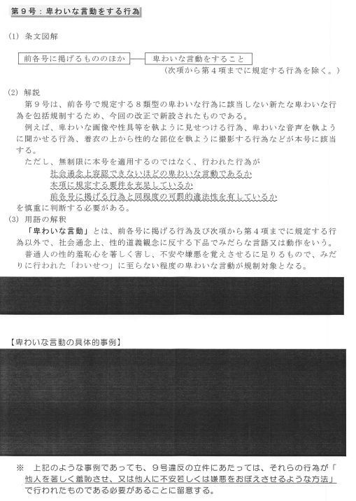 京都府警はあたかもアスリート盗撮に対応して改正したかのようにコメントしていますが京都府迷惑行為防止条例逐条解説(2020年4月)では具体例がマスクされています。